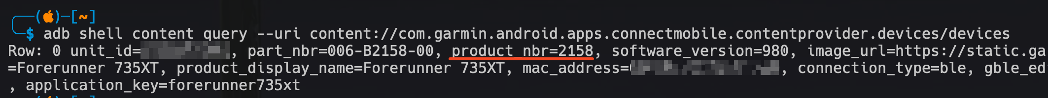 С помощью этого запроса извлекается первый элемент знаний - номер продукта. Конечно у пользователя может быть подключено несколько устройств, но это никак не влияет на саму цепочку эксплуатации. Все показанные далее шаги применимы к любым подключенным устройствам. Теперь, используя полученный номер устройства можно сделать запрос к URI content://com.garmin.android.apps.connectmobile.contentprovider.devices/devices/product_nbrs/2158, который должен вернуть ту же информацию, что и на скриншоте выше. При этом важно понимать, что к базе данных будет сделан следующий запрос: