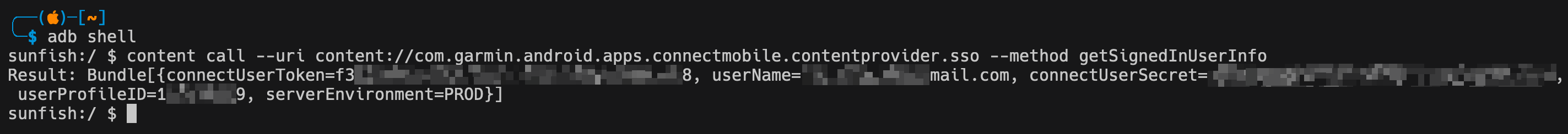 Из декомпилированного кода провайдера видно, что для получения пользовательских данных нужно вызвать метод getSignedInUserInfo. Здесь нет никаких дополнительных ограничений, а значит любое приложение может эту информацию получить. Я воспользовался adb чтобы посмотреть присутствуют ли заявленные данные в этом провайдере или он является устаревшим и пустым. Предварительно залогинившись в самом приложении, я вызвал метод getSignedInUserInfo